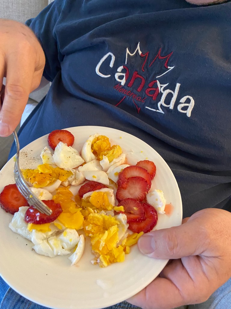 Ted’s culinary invention, hardboiled eggs and strawberries. There is a reason I don’t let him cook often.