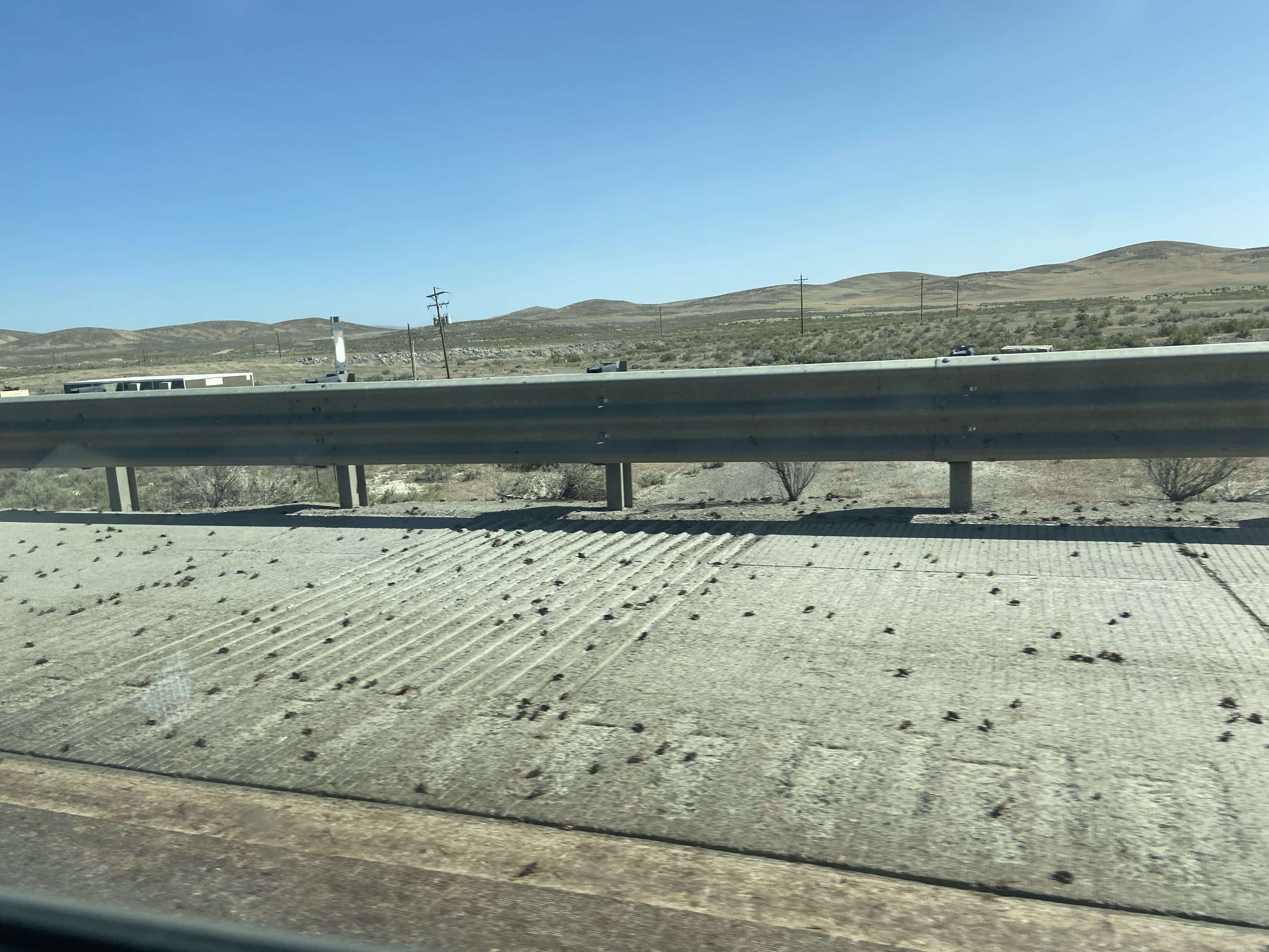 We finished with the windstorm to be greeted by the mormon cricket migration. Nothing is quite as icky as the sound of millions of bugs being squashed under the tires. Ugh!! All of the little dots are bugs about 1-1/2 inches long.